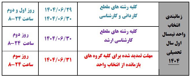 ضمن عرض تبریک ، خیرمقدم و آرزوی موفقیت برای کلیه پذیرفته شدگان مقطع کارشناسی ناپیوسته و کاردانی پیوسته سال تحصیلی ۱۴۰4  به اطلاع می رساند، متقاضیان می توانند جهت ثبت نام و تشکیل پرونده از روز دوشنبه مورخه 1404/07/14 لغایت روز پنج شنبه مورخه 1404/07/17 با همراه داشتن مدارک زیر به صورت حضوری مراجعه نمایند.